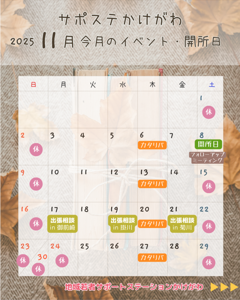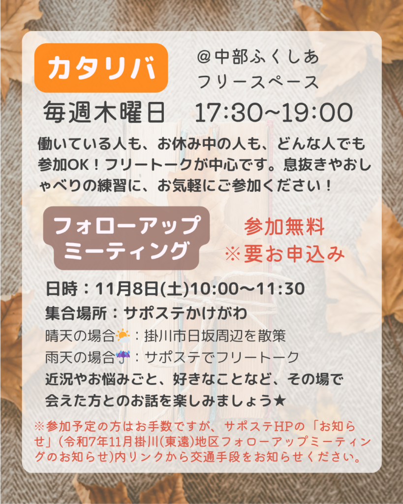 🍁内容:フリートーク、散策(雨天時はサポステでフリートーク)